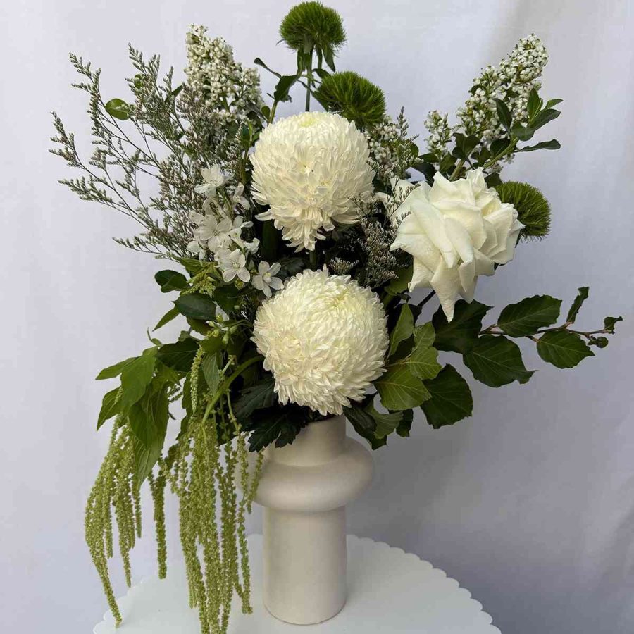 “Cotton Cloud” is a sleek vase arrangement featuring modern white and green blooms with pops of foliage to compliment. The clean, fresh combination creates a crisp, airy feel.